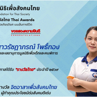 นางสาวรัชฎาภรณ์ โพธิ์ทอง กรรมการและเลขานุการ มูลนิธิเพื่อเด็กและคนพิการ เข้ารับรางวัลเกียรติยศ “รางวัลไทย ประจำปี 2569” จากท่านพลอากาศเอก ชลิต พุกผาสุข องคมนตรี ดังนี้